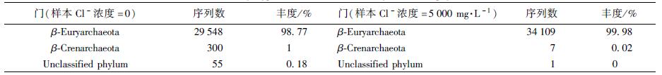 為進一步分析鹽度對厭氧顆粒污泥體系中微生物群落多樣性的影響, 分別對Cl-濃度為0和5000 mg ·L-1兩個反應器運行階段的厭氧顆粒污泥進行高通量測序和宏基因組分析, 表 3、4及圖 5、6分別展示了2個階段中古菌和細菌在門水平和屬水平分類層面上的類群分布情況.
