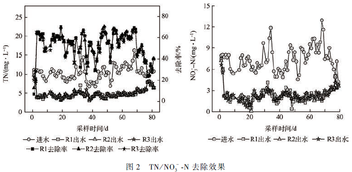 由圖2 可知,裝置啟動初期3 套反應(yīng)器TN 去除率均較低,但R1 < R2 < R3(分別為6. 9% 、12. 9% 和23. 4% ),接種回流污泥的反應(yīng)器去除率最高,未接種污泥的反應(yīng)器去除率最低。運行至第3 天,反應(yīng)器TN 去除率均迅速升至60% 以上(分別為63. 7% 、64. 9% 和65. 4% ),且出水TN 小于5 mg·L - 1 ;同時出水中NO3- -N 濃度在3 d 內(nèi)從8 mg·L - 1 降至小于3 mg·L - 1 。此后出水TN 和NO3- -N 濃度趨于穩(wěn)定,表明反應(yīng)器啟動成功,進入穩(wěn)定運行階段。