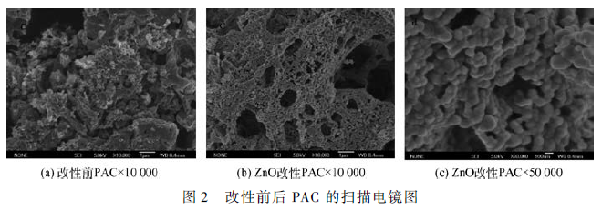 圖2 分別是改性前,及不同ZnO 改性濃度下的場發射掃描電鏡圖。由圖2(b)可以看出,ZnO 改性后的PAC 孔徑變大并仍然具有穩定的球狀結構,這是由于在改性過程中,聚丙烯腈纖維轉化成一種梯形鏈狀結構,該結構能夠抵抗高溫,最終得到穩定的多孔PAC 材料。由圖2(c)可以看出,有球狀的ZnO負載于PAC 的表面,該結果與紅外譜圖相一致,在制備過程中,Zn 取代H 負載于PAC,提高PAC 的吸附性能。