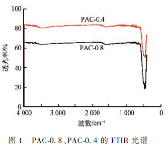 圖1 為頻率范圍(4 000 ~ 0 cm - 1 )的PAC-0. 8 和PAC-0. 4 紅外光譜。從已知的活性炭紅外光譜圖可知,PAC-0 在3 440 /1 595、1 451、1 219 和1 043 cm - 1處分別存在O—H 伸縮鍵,aromatic C—C 伸縮鍵,C—O 伸縮鍵,CH2 —O—CH2 的C—O 伸縮鍵。從圖1 中可以發現,ZnO 修飾過的活性炭在453 cm - 1 處存在一個加載的PAC 鋅的吸收帶。這些吸收帶的位置和數量不僅取決于晶體結構而且也取決于顆粒形貌和化學成分。已知ZnO 吸收帶的參考光譜在406 ~ 512 cm - 1。由此可知,圖中的吸收帶應該是ZnO 修飾造成的。
