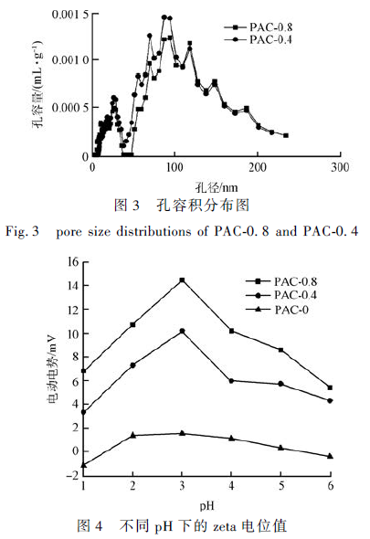 改性前后材料其Zeta 電位如圖4 所示。從圖4可知, 溶液pH 在1 ~ 3 時, PAC-0. 8、PAC-0. 4 和PAC-0. 0 吸附劑zeta 電位為正值,且逐漸升高。溶液pH 在3 ~ 6 時,PAC-0. 8、PAC-0. 4 和PAC 吸附劑zeta電位仍為正值,但逐漸降低。PAC-0. 8 始終高于PAC-0. 4;而且PAC-0. 8 和PAC-0. 4 zeta 電位的值也是始終高于PAC-0. 0。這種現象表明鋅的濃度直接影響吸附材料中帶正電荷離子數量。