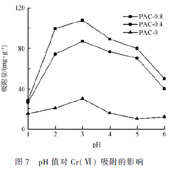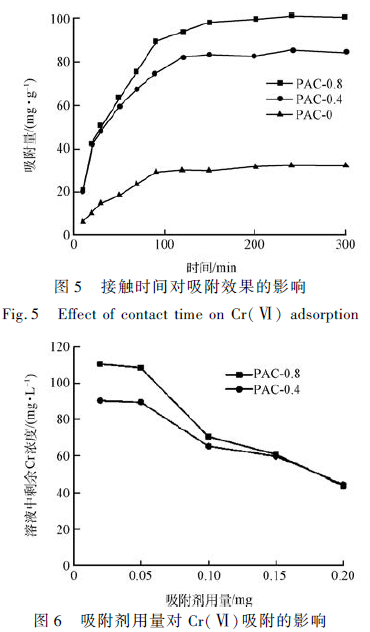 取50 mL 初始濃度為200 mg·L - 1 的Cr(Ⅵ)水溶液,分別投加0. 02、0. 05、0. 1、0. 15 和0. 20 g 3 種不同的吸附劑,24 h 后取樣過濾,測定吸光度,計算吸附量,考察吸附劑投加量對吸附效果的影響。在50 mL初始濃度為200 mg·L - 1 的Cr(Ⅵ) 水溶液中分別加入0. 05 g 的PAC-0. 8、PAC-0. 4、PAC-0. 0,用氫氧化鈉和鹽酸調節pH,24 h 后取樣過濾,測定吸光度,計算吸附量,考察pH 值在1 ~ 6 范圍內對Cr(Ⅵ)吸附的影響。