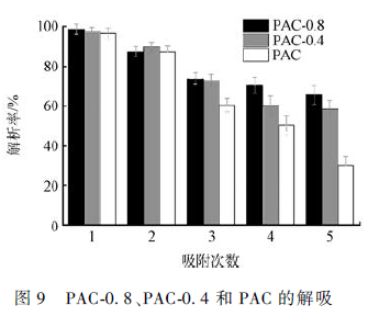 在實際應用中,為了降低成本,往往將吸附劑重復使用。在本實驗中也對吸附劑(PAC-0. 8、PAC-0. 4和PAC-0. 0)重復利用的效果進行了實驗驗證,如圖9 所示。由圖9 可知,3 種吸附劑前3 次的解析效果均超過70% 以上,這說明ZnO 改性聚丙烯腈基活性炭吸附材料在實際過程中具有很好的可重復性,因而具有較好的實際應用的可能。由圖9 可知,經過3 次重復使用以后,其活性下降到60% 左右。具體參見污水寶商城資料或http://www.xhxdt.com更多相關技術文檔。