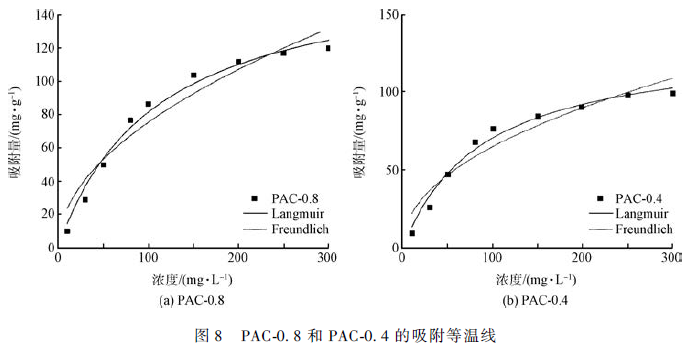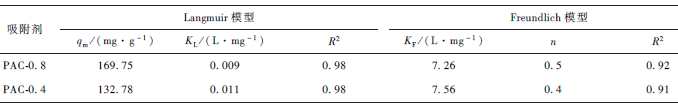 分別采用Langmuir 模型和Freundlich 模型對PAC-0. 8 以及PAC-0. 4 進行非線性擬合,其結果如圖8 所示。由表1 中確定的相關系數R2 可知,Langmuir模型比Freundlich 模型對PAC-0. 8 和PAC-0. 4 的吸附行為的擬合效果更好,其R2 值可以達到98% ,說明單層吸附的模式可能在這個材料去除Cr 的過程中占有主導作用。