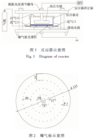實(shí)驗(yàn)采用圖1所示的石英DBD反應(yīng)器,外徑140mm,內(nèi)徑134 mm,高度100 mm,底板厚2 mm,內(nèi)部有4個(gè)長(zhǎng)度為15 mm直徑為6 mm的石英柱8固定在反應(yīng)器內(nèi)壁用來支撐曝氣板。反應(yīng)器壁上有2個(gè)石英制成的進(jìn)氣管3,實(shí)驗(yàn)氣體(空氣,O2)由2個(gè)進(jìn)氣管進(jìn)入反應(yīng)器。
