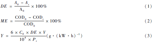 式中:A0為溶液的初始吸光度;A為處理時(shí)間為t時(shí)溶液的吸光度;V為處理液體的體積(mL);P為輸入功率(w);t為處理時(shí)間(min ) ; C0為溶液的初始濃度(mg /L) ;COD0為初始化學(xué)需氧量(mg /L'),CODt為處理時(shí)間為t時(shí)的化學(xué)需氧量(mg /L)。