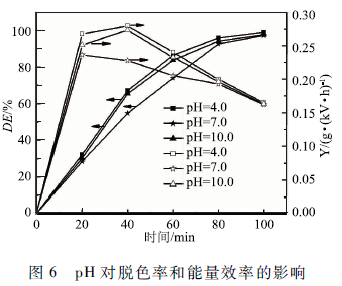 實(shí)驗(yàn)采用初始濃度為50 mg/L、體積50 mL的MB溶液,空氣流量60 SCCM,上氣室高度7. 5 mm,下氣室高度7 mm,輸入電壓6 kV。改變初始pH分別為4.0,7.0和10. 0。在圖6中可以看出pH=4.0和pH = 10. 0時(shí)MB的脫色率和能量效率都較高,pH =4. 0的脫色率最高。這是因?yàn)樵诒緦?shí)驗(yàn)中臭氧起到重要的降解作用,在酸性條件下臭氧的濃度較高主要發(fā)生臭氧的直接氧化反應(yīng),在堿性條件下主要發(fā)生通過輕基自由基(·OH)降解MB的間接氧化反應(yīng),而中性條件下,臭氧液相中的濃度較低。除此而外,pH會(huì)影響MB分子在水中的狀態(tài),解離的濃度不同也會(huì)導(dǎo)致速率常數(shù)的差別。綜合以上因索,酸性和堿性條件下MB的降解率和能量效率都較高,pH為4. 0時(shí)降解效果最好,選擇pH 4. 0為實(shí)驗(yàn)條件。