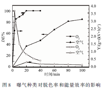 實(shí)驗(yàn)采用初始濃度為100 mg/L,體積50 mL,初始pH為4. 0,電導(dǎo)率為150 μS /cm的MB溶液,分別采用空氣、O2曝氣,氣體流量60 SCCM,上、下氣室高度分別為7. 5和7 mm,輸入電壓6 kV。如圖8所示,氧氣可以在20 min內(nèi)使MB的脫色率達(dá)到99. 98 %,而空氣需要100 min才能將MB脫色85.3 %。氧氣曝氣時(shí),處理3min能量效率最高,最高可達(dá)3.63 g / (kW · h),而空氣曝氣時(shí)最大能量效率在20 min時(shí)達(dá)到最大,最大能量效率為0. 31 g / (kW · h)。