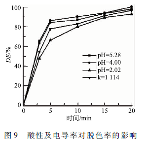 從2. 4的研究中可知酸性pH下MB的脫色率和能量效率都較高。為了進(jìn)一步研究酸性的增加對(duì)MB降解的促進(jìn)作用和NO的產(chǎn)生導(dǎo)致的反應(yīng)中毒(含氧活性物質(zhì)濃度的下降、電導(dǎo)率的升高)對(duì)MB的影響。在氧氣條件下,處理初始濃度為100 mg/L的MB溶液,分別調(diào)節(jié)MB溶液的pH為2. 02(空氣處理100 min時(shí)的pH為2. 07 ) 、4. 00和5. 28(不加硫酸的MB溶液的pH ),在pH為4. 00的溶液中加入硫酸鈉調(diào)節(jié)初始電導(dǎo)率(k)至1 114 μS / cm ,得到圖9。酸性增強(qiáng)對(duì)MB降解并不總是有利的,在pH從5. 28下降到4. 0時(shí),MB的脫色率增加,但是當(dāng)pH進(jìn)一步下降到2. 02時(shí),溶液的脫色率顯著下降。pH為5.28、4. 00和2. 02時(shí)溶液的電導(dǎo)率分別為64 、 150和4. 08 mS / cm 。強(qiáng)酸性條件不利于MB的降解,是由于電導(dǎo)率升高導(dǎo)致電場(chǎng)強(qiáng)度下降,等離子體隧道難于形成,活性物質(zhì)濃度下降,從而導(dǎo)致的MB的脫色率在強(qiáng)酸性條件下較低。電導(dǎo)率升高導(dǎo)致的MB降解抑制效應(yīng),在加入硫酸鈉調(diào)節(jié)初始pH為4. 0的MB溶液的電導(dǎo)率k=1 114 μS / cm 降解MB溶液的實(shí)驗(yàn)中,得到脫色率下降的結(jié)果中得到進(jìn)一步的證實(shí)。因此,酸性的增強(qiáng)對(duì)MB降解的促進(jìn)作用與酸性增強(qiáng)導(dǎo)致的電導(dǎo)率升高對(duì)MB降解的抑制作用相比較弱。因此,空氣曝氣時(shí)NOx的產(chǎn)生,導(dǎo)致的酸性效應(yīng)并不能加強(qiáng)MB的降解,NOx的產(chǎn)生導(dǎo)致的反應(yīng)中毒(氧化性物種中毒以及電導(dǎo)率升高等)是使MB的降解效率下降另一重要原因。
