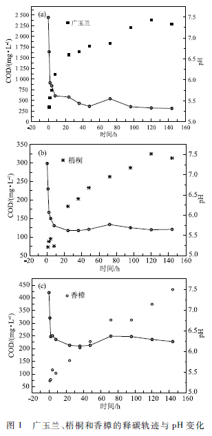 廣玉蘭、梧桐和香樟3種落葉的釋碳軌跡和pH變化規(guī)律,如圖1所示。可以看出,3種碳源物質(zhì)均具有可持續(xù)釋碳能力,在實驗的144 h內(nèi),3種碳源的釋碳規(guī)律較為相似,都是先快速上升,后來逐漸變緩;3種溶液的pH則呈現(xiàn)先直線式下降,后逐漸維持相對穩(wěn)定的趨勢。從碳源釋放情況看,廣玉蘭葉的碳源釋放量和速率均遠遠高于梧桐和香樟,在浸出第4小時時,廣玉_的碳源釋放量已達743 mg / L,單位質(zhì)量碳源釋放量達到37. 15 mg ·(g ·h)-1,碳源的最高釋放量出現(xiàn)在第120小時,為2 384mg / L,梧桐在經(jīng)歷最初2d的釋放后釋碳逐漸變緩,而香樟則一直呈現(xiàn)小幅增長的趨勢。最終廣玉蘭葉COD單位釋放量高達229.2 mg / g,香樟為43.3 mg / g,梧桐最少,只有31.3 mg / g。從pH變化規(guī)律來看,3種落葉浸出液pH值下降的拐點與其浸出液COD升高的拐點幾乎同時出現(xiàn),表明落葉浸出初期釋放的碳源中含有大量的酸性物質(zhì);落葉pH值變化幅度為:廣玉蘭>梧桐>香樟,側(cè)面反映出廣玉鑄葉的釋酸能力最強。