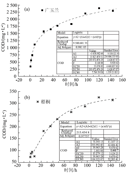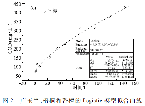 Higuchi模型(見表1)擬合度優(yōu)于二級動力學模型,此時廣玉蘭的釋碳速率系數(shù)為174. 69 mg · ( L . h0.5)-1,梧桐和香樟分別為24. 451和31. 459 mg · ( L . h0.5)-1,但廣玉蘭葉的擬合度稍欠佳;考慮到落葉中碳源成分相對復雜,最后采用Logistic模型對3種落葉釋碳特征的曲線進行擬合,擬合程度達到最優(yōu),如表1和圖2所示,該模型是一種阻滯增長模型,是對指數(shù)增長模型的基本假設(shè)進行修改后得到的,它考慮到增長減緩的原因是存在阻滯作用,真實反映了落葉在釋放碳源過程中可能受限于自身碳源結(jié)構(gòu),水溶液pH值等因素的限制,表明以落葉為碳源的緩釋系統(tǒng)屬于釋放機制較為復雜的禍合系統(tǒng)。因此,用Logistic模型可以較好地表征落葉中有機物在水中的釋放規(guī)律。
