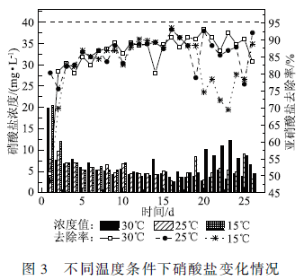 溫度是影響木質(zhì)纖維素物質(zhì)水解效率的一個重要因素。一般在低溫條件下,生物反硝化效果會明顯降低。這是因為纖維素降解菌大多屬于中溫型細菌,最適生長溫度在25 - 40℃范圍內(nèi)。過低的溫度會影響微生物活性,而當反應溫度處于中溫階段時,細菌的代謝速率會隨著溫度的升高而逐漸加快,微生物水解利用碳源物質(zhì)的速率也就隨之加快,體現(xiàn)在反硝化脫氮效率的提高。圖3顯示了在其他條件相同的情況下,以廣玉蘭葉為碳源的3組反硝化污泥分別在15 、25和30℃條件下的硝酸鹽去除效率。