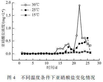 3組系統(tǒng)在反應的前13 d里均未出現(xiàn)亞硝酸鹽的積累,從第14天開始,3組系統(tǒng)先后出現(xiàn)硝酸鹽去除率的波動,同時除了15℃組,其他2組都出現(xiàn)較明顯的亞硝酸鹽累積現(xiàn)象,如圖4所示。有文獻報道,低溫條件下的反硝化過程亞硝酸鹽積累量明顯高于中溫(25℃)和高溫(35℃)條件,與本研究中結(jié)果有異。分析可能是由于生活污水和其他液體碳源在反硝化過程中可利用碳源總量是逐漸減少的,而廣玉蘭葉具有可持續(xù)釋放碳源的能力,實驗中3組溫度下的落葉投加量相同,由于等量的葉片可釋放的碳源總量相當,溫度越高,單位質(zhì)量落葉所釋放的COD增加量也越高,經(jīng)過一段時間的反應后,25和30 ℃ 2組系統(tǒng)可溶性易降解碳源逐漸減少,而當碳源有限時,硝酸鹽和亞硝酸鹽同時爭奪碳源,硝酸鹽的競爭能力較強,因此,出現(xiàn)了較低濃度的亞硝酸鹽累積現(xiàn)象;15℃組由于碳源釋放較慢,到反應后期,可利用碳源反而相對充足,充足的碳源抵消了溫度的不良影響。實驗中亞硝酸鹽累積的最高濃度小于2 mg / L ,對系統(tǒng)反硝化過程影響較小,表明廣玉鑄葉可以作為反硝化外加碳源。