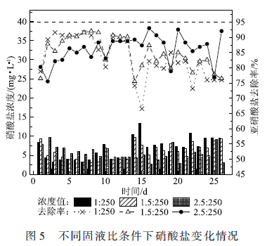 固液比分別為1:250,1.5:250和2.5:250,反應溫度為(25士1)℃時,各系統(tǒng)連續(xù)運行26 d內(nèi),進出水的硝酸鹽去除和亞硝酸鹽積累情況如圖5和圖6所示。