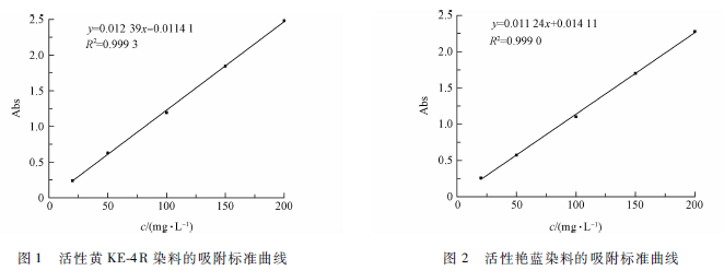 測(cè)定不同濃度的KE-4R和RBB模擬廢水溶液的吸光度,繪制出上述2種模擬廢水溶液濃度對(duì)應(yīng)的吸光度標(biāo)準(zhǔn)曲線,如圖1、圖2所示。
