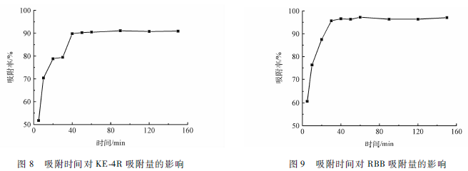 分別取50 mL的50 mg / L的KE-4R和RBB模擬廢水溶液,將其置于150 mL的錐形瓶中,于各自的最適溫度(30 ℃ 、25℃)下振蕩并加人各自最佳投加量(0.3 g、0.1 g)的LDO,每隔一定時(shí)間,取樣,離心,取上清液測(cè)定其吸光度,并計(jì)算LDO對(duì)KE-4R和RBB的去除率,繪制吸附曲線,如圖8和圖9所示。