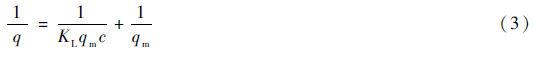 式中:q為平衡吸附量,mg / g ;c是平衡時(shí)的溶液濃度,mg /L ;qm是吸附量的理論最大值,mg / g ,kL是Langmui:吸附等溫線參數(shù),L / mg。