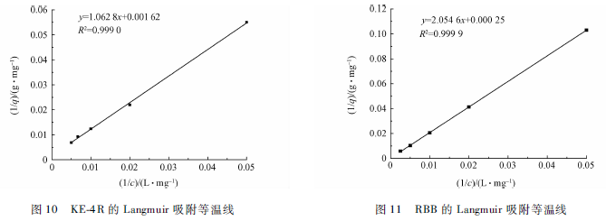 將LDO吸附KE-4R和RBB進(jìn)行Langmuir等溫式線性回歸和數(shù)據(jù)擬合,結(jié)果如圖10和圖11所示。