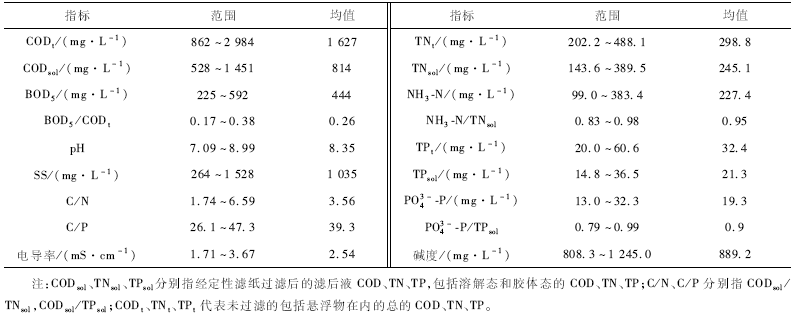 實驗所用黑水的水質波動很大,尤其是不同季節(旱季、雨季)的差異性很大,C/N和C/P均較低,污水的堿度平均僅889. 2 mg /L。