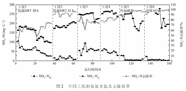 各工況的進水NH3-N濃度平均值分別為142. 1 ,191. 4,241. 9,257. 2,219. 0,236. 7 mg / L,出水NH3-N濃度平均值分別為53.6,14.0,58.7,47.7,8.3,5.6 mg / L,NH3-N去除率平均值分別為62.3 %、92.6% ,75.7% ,81.5% ,96.3% ,97.7%。可見,春冬季低溫條件下,出水NH3-N若要達到一級排放標準,H RT需達到42 h。夏季高溫期(工況3 ,4)進水NH3-N的濃度超過200 mg / L,出水均未達到二級排放標準,且出水pH分別低至5. 81 ,5. 90,說明過低的pH已嚴重影響生物硝化效率。分析其原因在于:1)黑水自身堿度不足,無法實現氨氮完全硝化;2)黑水的C/N,B/C較低,可用于反硝化的易降解COD偏低,導致反硝化效果不佳,因此提供的反硝化堿度不足。工況5外加碳源后,出水的氨氮濃度達到一級A排放標準;工況6采用多級AO分時進水的運行模式,最大程度地利用了進水的碳源和堿度,出水氨氮同樣達到一級A排放標準。