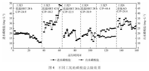 如圖4所示,不同工況條件下,進水的磷酸鹽平均值分別為17. 1,31.4,18.5,18. 1,22.3,29.3 mg / L,出水的磷酸鹽平均值分別為17.3,32.7,19. 1,19.7,16.9,28.8 mg / L。可以看到,未外加碳源時沒有磷酸鹽去除效果,出水磷酸鹽稍有所上升,外加碳源后磷酸鹽去除率范圍25. 1%一35.9%。各工況的C/P平均值分別為24.9,18.2,22.5,30.9,44.4,24.4,磷酸鹽已大大超出微生物營養所需求,且實際黑水中所含碳源種類復雜,B/C僅有0. 26,大多數碳源不能為聚磷菌所用,以更適合模擬黑水水質的糖蜜作為碳源配制人工模擬黑水的除磷效果較蔗糖作為碳源明顯惡化,聚磷菌占活性污泥比例低。此次實驗的黑水中懸浮態TP占比65.7%,而定性濾紙濾后液的TPsol中10%為有機磷,系統微生物生長去除小部分TP,而釋磷吸磷作用弱,通過聚磷菌去除的TP少,出水中TP基本上為磷酸鹽,黑水中懸浮態、膠體態和溶解態的有機磷轉化為磷酸鹽后未被全部去除,由此導致出水磷酸鹽較進水稍有所上升。