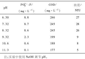 2)直接加堿調節pH沉淀磷。人體每天排放0. 12 g Mg,0. 67 g Ca到黑水(人體大小便和沖洗水,體積為25一35 L)中,則黑水中的Mg,Ca離子濃度分別有4 mg / L,22. 3 mg / L,如果黑水呈堿性,則Mg, Ca離子可與磷酸根離子形成沉淀,達到去除磷酸鹽的目的。據此調節SBR出水的pH觀察磷酸鹽和其他污染物的去除效果,如表5所示。可見,出水的pH調至8.32以前,PO4^3- -P濃度幾乎沒有降低;當pH調至9.32時,PO4^3- -P快速下降;進一步調節pH調至10. 6 , PO4^3- -P濃度可低至0. 6 mg / L;如果pH調至11. 3,殘余的PO4^3- -P僅有0. 1 mg / L ,去除率達到99.3 %,與此同時,COD、濁度也分別降至177 mg / L ,5 NTU,去除率分別28.0% ,83.0%。但實驗所用出水的磷酸鹽濃度相對較低,若出水磷酸鹽高達20一30 mg / L,單純加NaOH調節pH很難使出水磷酸鹽達到排放標準。磷酸鹽濃度為40 mg / L左右時,投加300 mg / L的Ca(OH)2,磷酸鹽濃度可以降至0. 4 mg / L,相對于硫酸鋁(投加量1 100 mg / L),PAC(投加量1 200mg / L),藥劑投加量大大減少,相應的污泥產生量也大大減少。