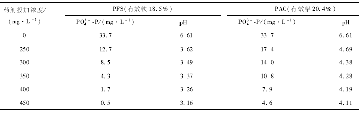 1)添加混凝劑PFS/PAC。以SBR的出水分別投加一定濃度的聚合鐵或聚合鋁,混凝沉淀除磷,結果見表4。實驗結果表明,每去除單位質量磷需要的有效鐵、有效鋁含量分別為2. 20一2. 51 g·g-1和3. 10-3. 16 g / g。若要使出水磷酸鹽達到一級A排放標準,則需投加的聚鋁、聚鐵分別達103.9 mg / L(以鋁計),83. 3 mg / L(以鐵計)。SBR出水的pH僅有6. 61 ,剩余堿度極低,加人83 mg / L的PFS(以鐵計)后,pH下降3. 45個pH單位;加人92 mg / L的PAC(以鋁計)后,pH下降2. 50個pH單位。出水明顯呈酸性,排放前尚需加堿進行pH調節。