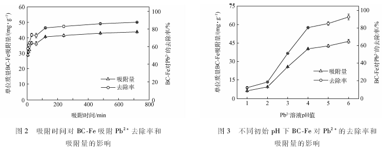 BC-Fe對Pb2+的吸附較快,在吸附時間為5 min時已經(jīng)達到吸附總量的50%以上,2h時已達到吸附平衡。去除率以及單位質(zhì)量吸附量的變化趨勢一致。隨著吸附時間的延長,BC-Fe對Pb 2+的去除率逐漸增加,在吸附時間為2h時達到81.3%,繼續(xù)延長吸附時間,去除率增幅較小,在12h時達到87.6%,增加了6. 3 %。單位質(zhì)量的BC-Fe對Pb2+的吸附量在吸附時間為2h時達到40. 6 mg / g ,基本達到飽和吸附狀態(tài),而后隨吸附時間的延長,在12h時達到43. 8 mg / g,比2h時增加了3.2 mg。溶液中吸附劑與吸附質(zhì)的結(jié)合是一個漸進過程,需要一定的時間才能達到平衡。由于BC-Fe對Pb2+的吸附可能存在多種吸附機理,推測在初始吸附階段,主要發(fā)生的是表面吸附,物理吸附占主導(dǎo)地位,Pb2+能快速占據(jù)BC-Fe表面的活性位點,隨著吸附時間的延長,BC-Fe表面的活性位點減少,吸附量以及去除率增幅較為緩慢最后達到平衡。