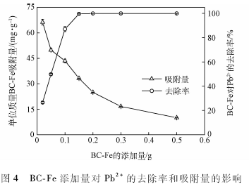 圖4為BC-Fe添加量對Pb2+去除率和吸附量的影響。可以看出,BC-Fe對Pb2+的去除率隨著BC-Fe添加量的增加而增加,而吸附量隨著添加量的增加而降低。當(dāng)BC-Fe添加量由0. 02g增加到0. 15g時,Pb 2+的去除率由26. 5%上升至99.9%,之后再增加BC-Fe的用量,去除率無明顯變化,達到飽和吸附。在BC-Fe添加量為0. 02 - 0. 5 g時,單位質(zhì)量的BC-Fe吸附量逐漸下降,由66. 3 mg / g下降至9. 99mg / g。 BC-Fe對Pb2+的去除率和吸附量隨添加量變化的主要原因是由于溶液中Pb2+濃度一定時,增加吸附劑的用量,同時也增加了吸附劑的總比表面積,增多了可供吸附Pb2+的吸附位點,從而使去除率增加;在Pb2+為100 mg / L的溶液中,BC-Fe添加量為0.15g時,吸附已基本達到飽和,再增加BC-Fe的用量(0. 15一0. 5 g ),導(dǎo)致了單位質(zhì)量吸附劑上的Pb2+吸附量下降。這與耿勤等的研究結(jié)果相一致。