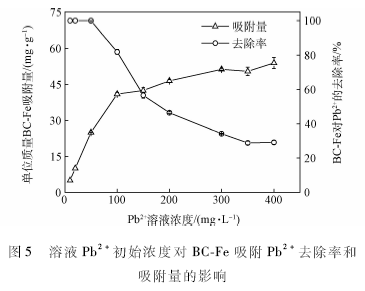 在一系列150 mL錐形瓶中,加人pH值為5. 0,初始濃度為10,20,50,100,150,200,300,350,400 mg / L模擬含Pb2+廢水50 mL,然后分別加人0. 100 g BC-Fe ,25℃振蕩2h,過濾,保存待測。