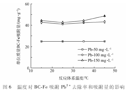 在一系列150 mL錐形瓶中,加人pH值為5. 0、初始濃度為100 mg / L的模擬含Pb2+廢水50 mL,然后分別加人0. 100 g BC-Fe,于15 ,25 ,35 ,45 ℃下振蕩2h后,過濾,保存待測。