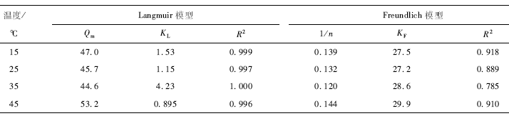 由表2可知,在溫度為15,25,35,45 ℃時,Langmuir方程擬合的相關(guān)系數(shù)R2分別為0. 999 , 0. 997 ,1. 000 ,0. 996,明顯高于Freundlich方程的相關(guān)系數(shù)0. 785 ,0. 889 ,0. 918 ,0. 910。由此可見,Langmuir等溫吸附方程能更好地描述BC-Fe對Pb2+的吸附特性,表明該吸附反應(yīng)近似單分子層吸附。且由Langmuir方程計算出的飽和吸附量,隨溫度的增加先降低再增加,在35℃達到最低為44. 6 mg / g ,在45℃時達到最高為53. 2 mg / g。由Freundlich模型計算出的參數(shù)可以看出,吸附指數(shù)1/n介于0. 1 - 0. 5之間,表明該吸附容易進行。在溫度為45℃時,吸附指數(shù)1/n及K。數(shù)值相對較大,表明45℃時吸附質(zhì)與吸附劑的吸附親和力最強。