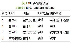 如表 1所示,實驗設計4種MFC構型,菌體A為AnAOB菌,菌體B為乙酸鹽降解菌,其中a、b-MFC分別為陽極型和陰極型Anammox-MFC實驗組;c、d-MFC的設計旨在與b-MFC對比,進行Anammox陰極與傳統的空氣陰極各方面性能的比較,同時探究乙酸鹽降解菌陽極對反應體系的作用. 其中,為了保證空氣陰極性能的可比性,對a、c-MFC空氣陰極碳布材料靠近陰極液的一側涂抹0.5 mg·cm-2的10%鉑碳催化層(羅凈凈等,2016),同時使空氣陰極液與其對應的陽極液底物濃度相同,以避免質子交換膜兩端電導率差別對實驗結果造成影響,并調節空氣陰極液初始pH為3.0,以促進其O2還原. 各實驗組全周期置于(33±1)℃的恒溫培養箱(賽福SPX-250)中.