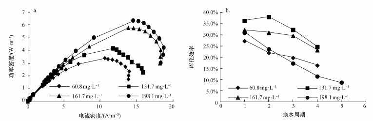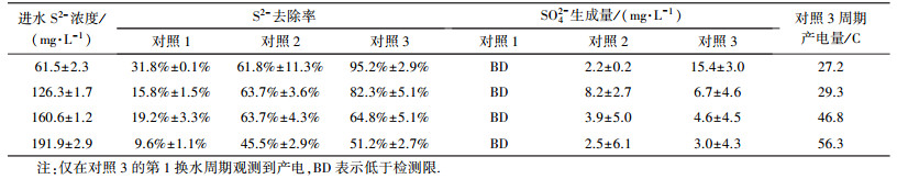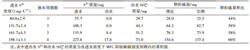 如表 2所示, S2-去除負荷隨進水S2-濃度的增加而增加, 但進水S2-濃度為(161.7±4.5) mg·L-1時第1周期出水有少量S2-殘余(4.4 mg·L-1), 進水S2-濃度為(198.1±3.1) mg·L-1時各周期出水均有較多的S2-殘余(20.1~35.2 mg·L-1), 表明進水S2-濃度不宜超過161.7 mg·L-1.陽極出水SO42-濃度隨換水周期數及進水濃度的增加而增加.進水S2-濃度為(60.8±2.9)、(131.7±2.4)、(161.7±4.5)、(198.1±3.1) mg·L-1時, 根據SO42-驟升確定相應的碳刷清洗周期分別為3、3、3和4個換水周期.本研究中陽極未接種污泥, 但陽極進水也未滅菌處理, 因此, MFC長期運行過程中仍可能引入硫氧化菌, 并在陽極室器壁及質子膜上繁殖.與無菌對照試驗相比(表 1), 相近進水濃度下MFC的S2-去除率和SO42-產量更高.其主要原因在于:① 陽極室器壁及質子膜上硫氧化菌的生物氧化作用加速了S2-的去除和SO42-的生成; ② 陰極電活性微生物的電化學作用推動了陽極S2-的去除和SO42-的生成.