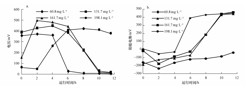 如圖 4所示, 各進水濃度下的MFC輸出電壓和陽極電勢與陽極S2-濃度密切相關.結合圖 3與圖 4發現, 陽極S2-濃度低于6.2~17.4 mg·L-1時, 陽極電勢上升至-23~-70 mV, 電壓值開始快速下降.陽極S2-耗盡( < 0.5 mg·L-1)時, 陽極電勢變為正值, 但電壓并未降至0 mV(16~31 mV), S通過電化學作用進一步氧化成SO42-是MFC繼續產電的原因.由圖 4a可知, 每個進水S2-濃度下最后1個運行周期內MFC的輸出電壓總體呈先上升后下降的趨勢, 更換廢水后MFC需重新適應相應濃度的水質, 因此, 初始電壓并非最高值, 后期隨著S2-的消耗則電壓逐步下降.進水S2-濃度為(198.1±3.1) mg·L-1時, 后期未出現電壓下降, 則是由于11.5 h后仍有充足的電子供體S2- (20.8 mg·L-1).以硫化物和葡萄糖為陽極基質的MFC分批試驗中存在類似的電壓變化趨勢(Zhang et al., 2009).增加進水濃度有利于MFC電壓升高并延長穩定產電時間.進水S2-濃度為(60.8±2.9)、(137.1±2.4) 和(161.7±4.5) mg·L-1時, 換水周期內穩定電壓的持續時間分別為4、6和6 h, 相應的最高電壓分別為371、447和496 mV.進水S2-濃度升為(198.1±3.1) mg·L-1時, 11.5 h后仍可穩定產電( > 377 mV), 但上個換水周期陽極出水殘余的S2-進入陰極后會抑制陰極反應, 導致最高電壓回降到419 mV.綜合MFC的產電與污染物去除情況, 進水S2-濃度為(60.8±2.9)、(137.1±2.4) 和(161.7±4.5) mg·L-1時的換水周期時間可分別縮短為6、8和8 h.