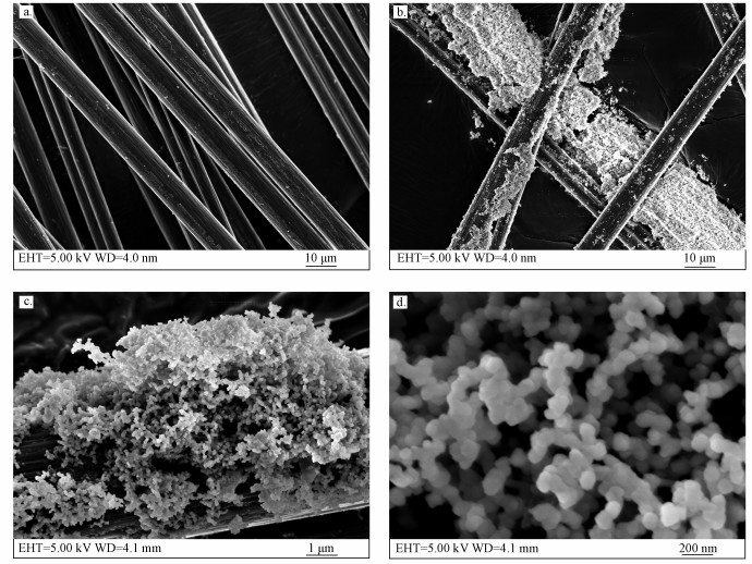 圖 5 陽極碳纖維絲FESEM圖(a.空白碳纖維絲, ×1000; b.陽極碳纖維絲, ×1000; c.陽極碳纖維絲, ×10000;d.陽極碳纖維絲, ×50000)
