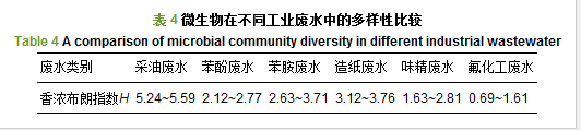 根據文獻報道, 表 4列出了活性污泥在處理6類化工廢水時, 活性污泥微生物豐富度的變化情況, 豐富度大小依次是采油廢水(裘湛等, 2006)>造紙廢水(郭建國等, 2014)>苯胺廢水(余彬彬等, 2009)>苯酚廢水(段佩玲等, 2015)>味精廢水(于魯冀等, 2014)>氟化工廢水(本研究).顯然, 菌種豐富度最低的是氟化工廢水處理工藝中的活性污泥, 進一步反映出氟化工廢水較差的可生化性.