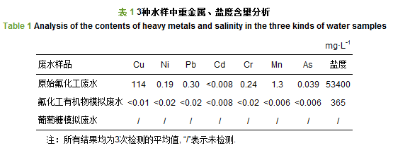 由表 1可知, 氟化工原始廢水中含有Cu、Ni、Pb、Cd、Cr、Mn、As等重金屬, 且鹽度值高達53400 mg·L-1;經過SPE小柱萃取所得的氟化工有機物模擬廢水, 其重金屬含量都在檢測限以下, 鹽度值為365 mg·L-1, 不同廢水水質差異明顯.