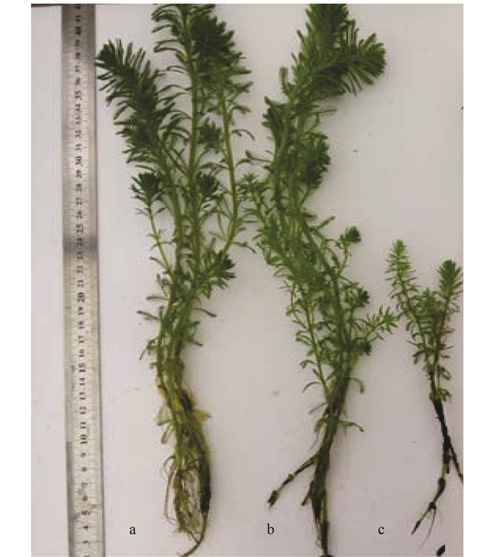 綠狐尾藻(Myriophyllum aquaticum), 別稱綠羽毛草, 為挺水或沉水植物, 原產(chǎn)于南美洲, 屬于小二仙草科狐尾藻屬, 作為景觀植物引入我國已有200多年, 主要生長在稻田、溪流、池塘區(qū). Best等對受美國衣阿華陸軍彈藥廠爆炸物所污染的地表水進(jìn)行水生和濕地植物修復(fù)的篩選與應(yīng)用中發(fā)現(xiàn), 綠狐尾藻的處理效果最佳.綠狐尾藻沉水的部分含有40%~89%的總氮(TN), 具有儲(chǔ)存N的能力, 而且葉片含有更多的N, 其對NH4+-N有很強(qiáng)的偏好性和耐受力. Souza等利用綠狐尾藻作為生物調(diào)節(jié)器處理污染水體的研究表明, 30 d后, 污染物最大的去除率表現(xiàn)為:BOD 75.4%, COD 67.4%, NH4+-N 98.6%, TN 88.3%, 總磷(TP)93.6%.近5年, 中國科學(xué)院亞熱帶所利用綠狐尾藻構(gòu)建的人工濕地系統(tǒng), 研究表明其對不同濃度的TN和NH4+-N的平均去除率分別可達(dá)到90%和84%以上; 綠狐尾藻作為生物調(diào)節(jié)器改變了水體中微生物的生長環(huán)境, 影響硝化與反硝化微生物豐度、多樣性與群落分布, 加速了NH4+-N和TN的去除.