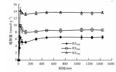生物炭的制備:水稻秸稈采自山東省濟寧市曲阜市南泉村, 秸稈采回后經自來水洗凈、風干和破碎后, 轉入粉碎機粉碎, 稱取20 g水稻秸稈碎末于坩堝中, 蓋好蓋子并用錫箔紙包裹密封后放入馬弗爐中, 以10 ℃·min-1的升溫速率, 從室溫加熱到不同的溫度(300、500和700 ℃)下炭化3 h, 自然冷卻至室溫后, 密封裝瓶備用;將炭化產物研磨并過60目篩, 用300 mL 1 mol·L-1的鹽酸處理4 h, 以去除炭酸鈣等灰分物質, 過濾, 用蒸餾水洗滌至洗液呈中性后放入80 ℃烘箱中烘24 h, 轉入塑封袋中保存備用, 編號分別為RS300、RS500、RS700(RS代表水稻秸稈, 數字代表炭化溫度).