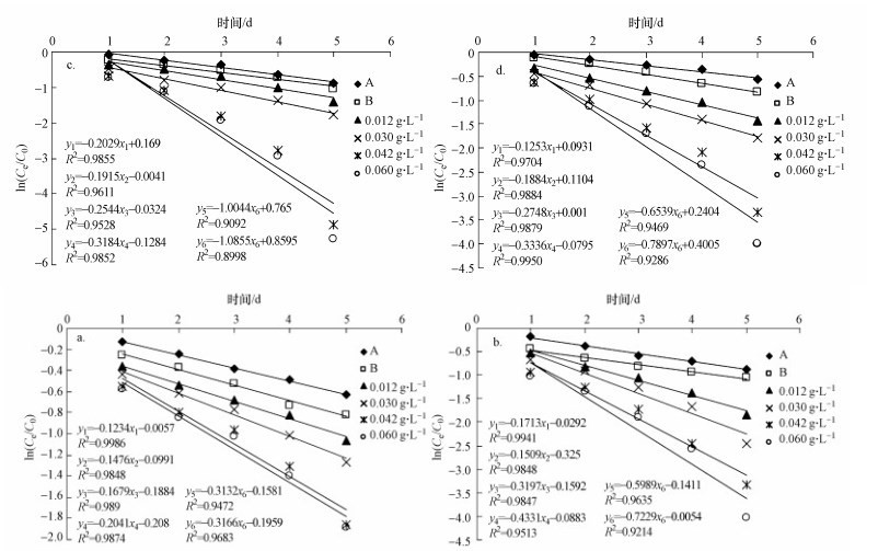 根據以上動力學模型, 將不同投菌量時污染物在濕地系統的出水濃度記作Ce(水力停留時間5 d內), 進水濃度記作C0, 以ln(Ce/C0)為縱坐標, 以時間t為橫坐標, 繪制CODCr、NH4+-N、TN和TP的時間變化曲線, 結果如圖 5所示(圖中x1~x6分別表示A、B、0.012、0.030、0.042、0.060 g·L-1投菌量下的時間).同時, 將各投菌量在水力停留時間第5 d時的COD、NH4+-N、TN和TP測定結果代入式(2), 計算出的kv如表 3所示.