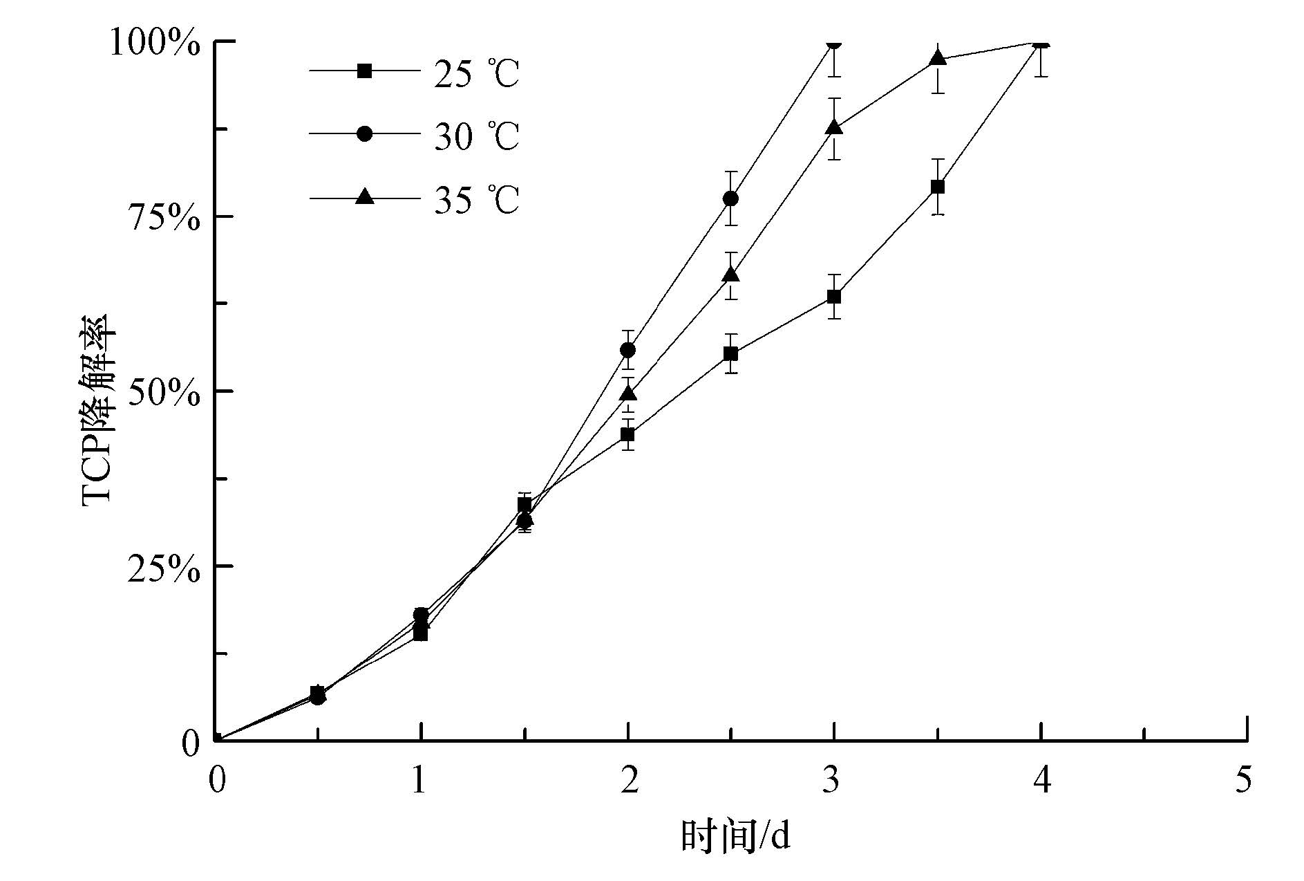 圖 1是不同溫度條件下鐮刀菌對TCP的降解效果. 由圖 1可知,在25~35 ℃條件下,鐮刀菌均能以TCP為唯一碳源和能源物質進行生長. 在30 ℃時,TCP完全降解僅需3 d;而25 ℃和35 ℃時,TCP完全降解則需4 d. 這與鐮刀菌體內TCP相關降解酶活性有關,可能是30 ℃時TCP降解酶活性最強所致.