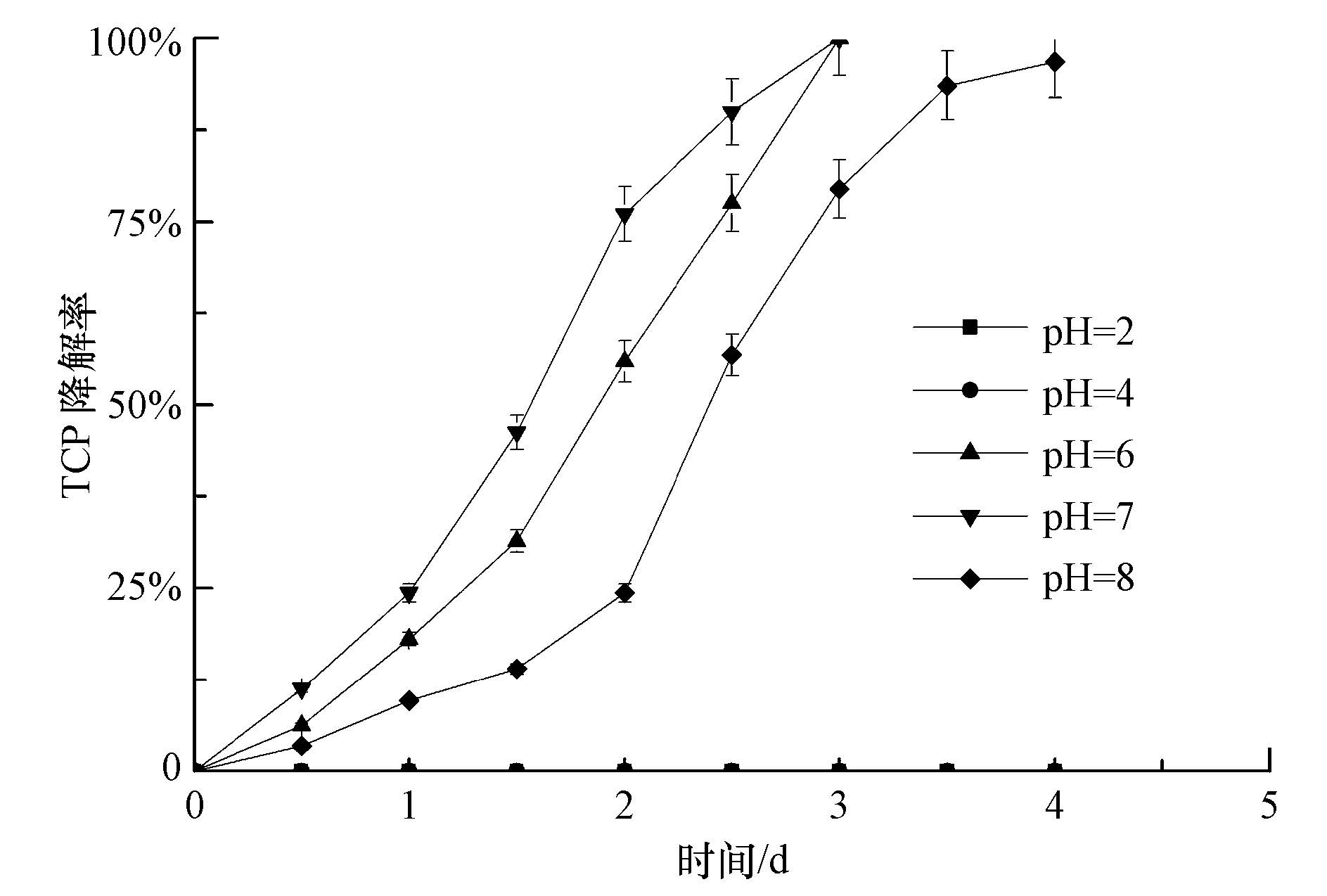 圖 2為不同pH條件下鐮刀菌對TCP的降解影響. 由圖 2可知:pH=7時鐮刀菌對TCP的降解速率最快,3 d降解完成;而pH=6時鐮刀菌對TCP的降解速率稍慢,但TCP完全降解也只需3 d. 當pH=8時鐮刀菌對TCP降解受到了一定的抑制,4 d時TCP降解率為97%. 此外,當pH=2或pH=4時,鐮刀菌對TCP幾乎沒有降解能力. 因此,可認為鐮刀菌在中性或者弱酸弱堿環境中利用TCP進行生長,最適pH=6~7.