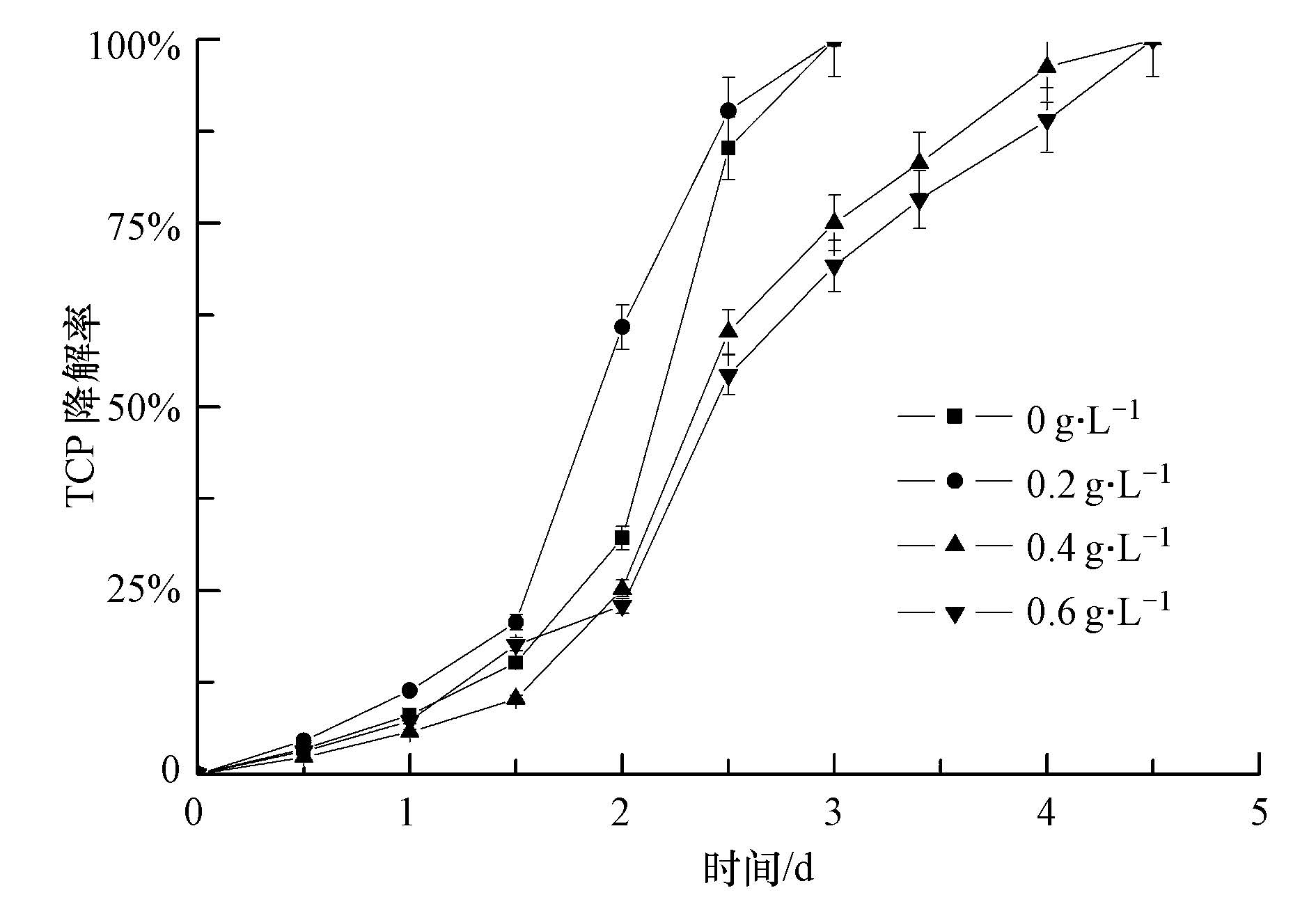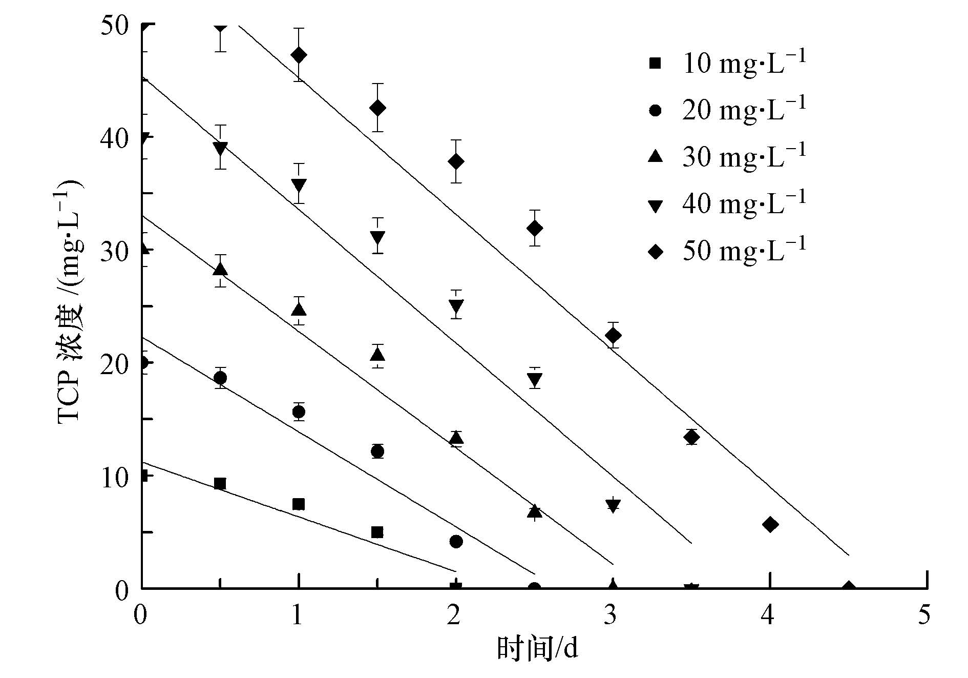 濃度對鐮刀菌降解TCP的影響如圖 6所示,當TCP濃度在10~50 mg·L-1范圍內時,鐮刀菌均可將其完全降解. 鐮刀菌對TCP的降解速率則隨著TCP濃度的增加而逐漸減緩. 當TCP濃度為10 mg·L-1時,鐮刀菌對其完全降解最快只需2 d即可完成;但當TCP濃度提高到50 mg·L-1時,鐮刀菌對其完全降解則需4.5 d才能完成.