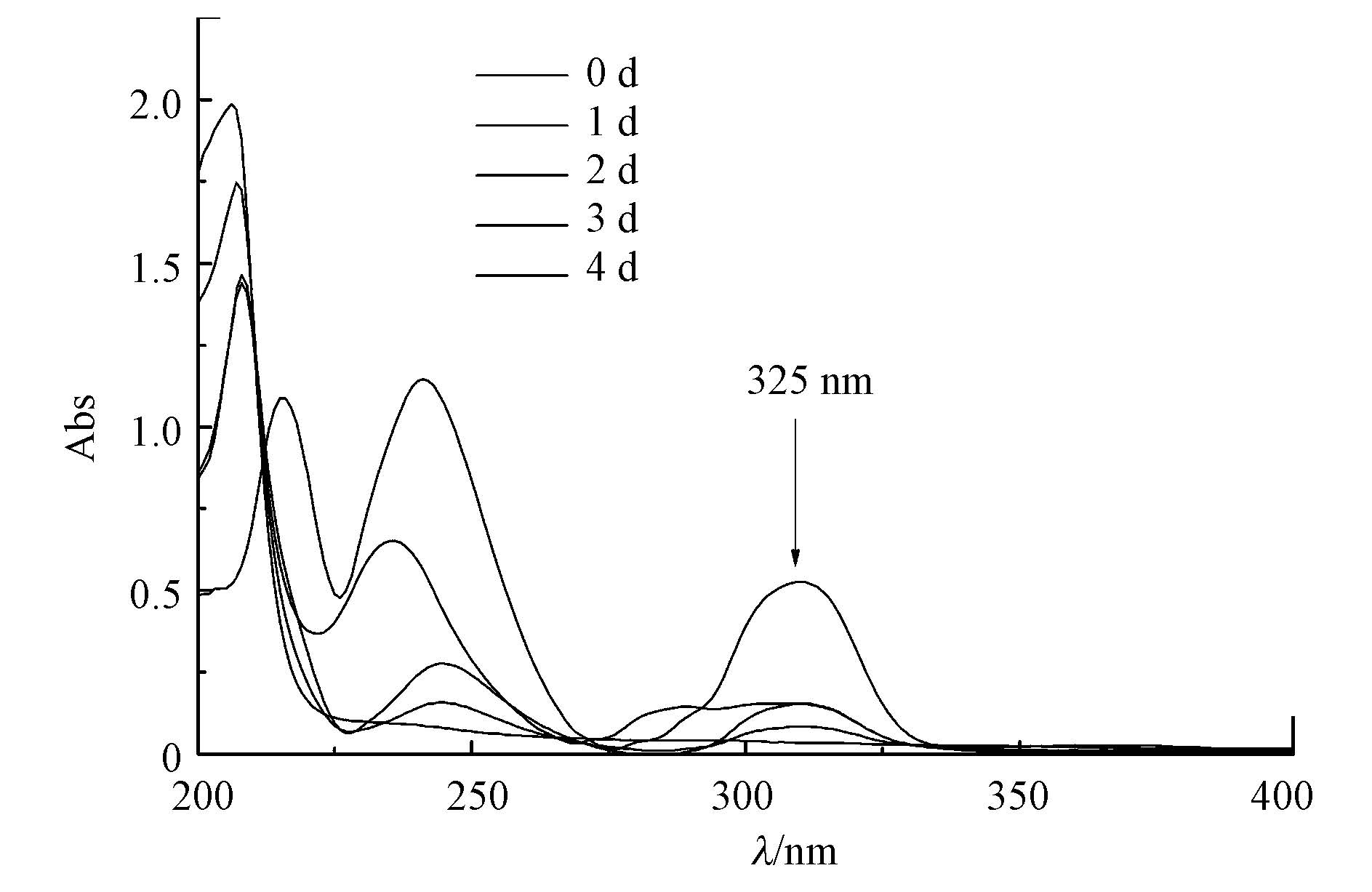 圖 7是鐮刀菌以TCP為唯一碳源和能源物質時的降解產物紫外掃描圖. 在圖 7中,TCP的特征吸收波長為325 nm,隨著時間推移,其特征峰逐漸消失. 當降解4 d時,其特征峰則完全消失,沒有新的峰產生,這說明TCP已被完全降解.
