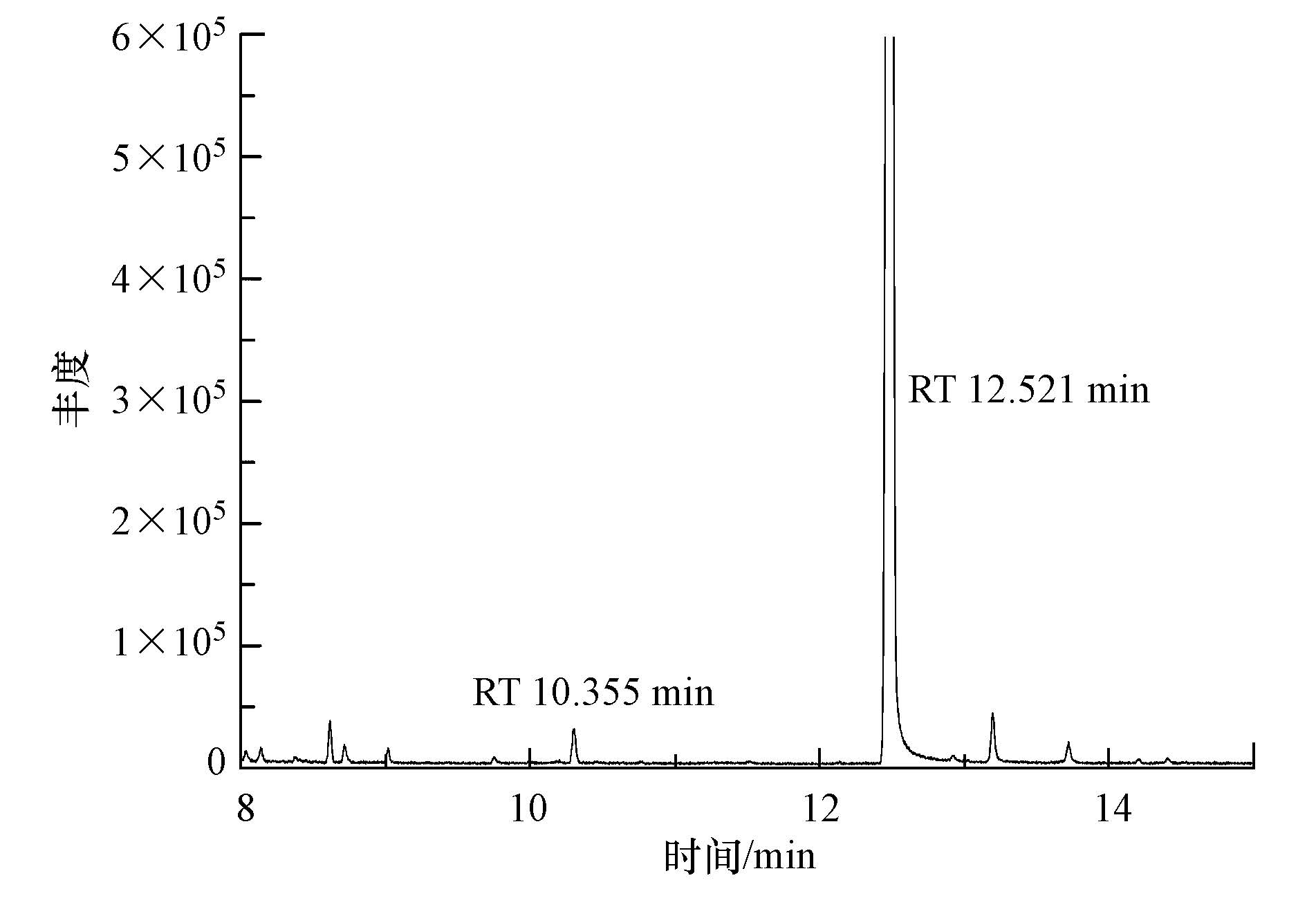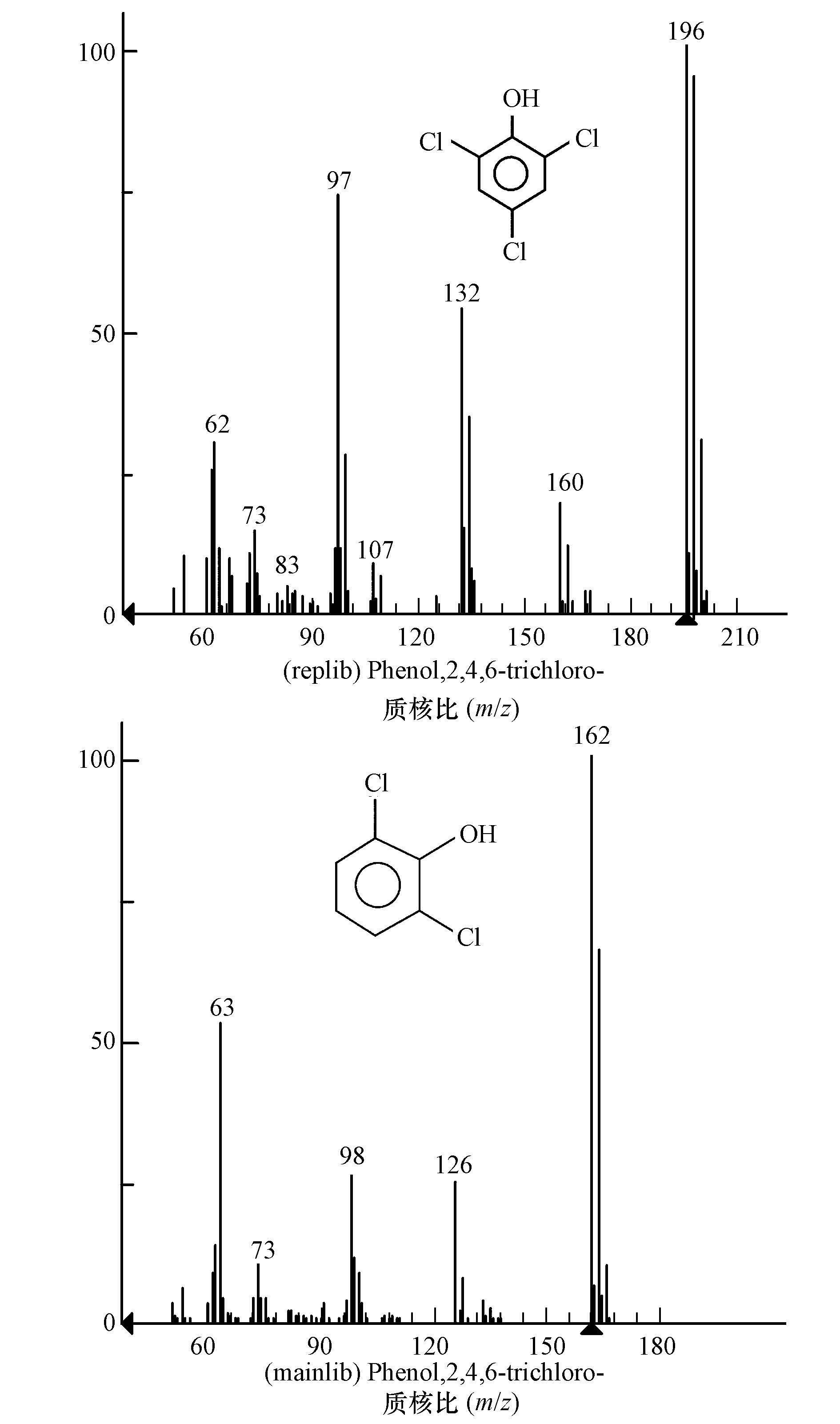 圖 8為鐮刀菌對TCP降解2 d的氣相色譜圖,圖 9為TCP降解產物的質量色譜圖. 由圖 8與圖 9知,TCP的保留時間為12.521 min,特征離子m/z為196. 此外,在10.355 min時也出現了一個較為明顯的峰(圖 8),特征離子m/z為162,經NIST檢索為2,6-二氯苯酚,根據相關資料可推斷其可能為TCP降解中間產物(Spain et al.,1989;全向春等,2003).