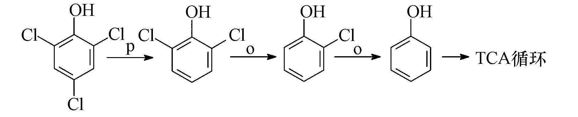 文獻(Li et al.,l1991)認為,Azotobacter sp.等對TCP代謝降解途徑主要是偏苯三酚途徑,是在2,4,6-TCP-4-單加氧酶(同時存在FADH2和NADH)的作用下依次將對位和鄰位上的氯原子脫去并氧化,形成2,6-二氯對苯二酚,再進一步代謝為6-氯偏苯三酚,進一步脫氯后形成偏苯三酚,然后在偏苯三酚1,2-雙加氧酶的作用下鄰位開環形成馬來酰乙酸,最后進入三羧酸循環進行完全礦化. 在厭氧條件下微生物對TCP的降解途徑是通過直接鄰位/對位脫氯生成2,4-二氯苯酚/2,6-二氯苯酚,再分別通過鄰位或對位脫氯生成苯酚,最后被礦化(Kennes et al.,l1996; Nicholson et al.,l1992 ).根據實驗結果,可推測得出鐮刀菌對TCP的降解途徑如圖 10所示. 它是通過2,6-二氯苯酚途徑進行降解的,這是一個直接脫氯的過程. TCP首先經過對位脫氯形成2,6-二氯苯酚,2,6-二氯苯酚再通過鄰位脫氯形成2-氯苯酚,最后2-氯苯酚鄰位脫氯形成苯酚,隨后進入三羧酸循環,完全礦化.