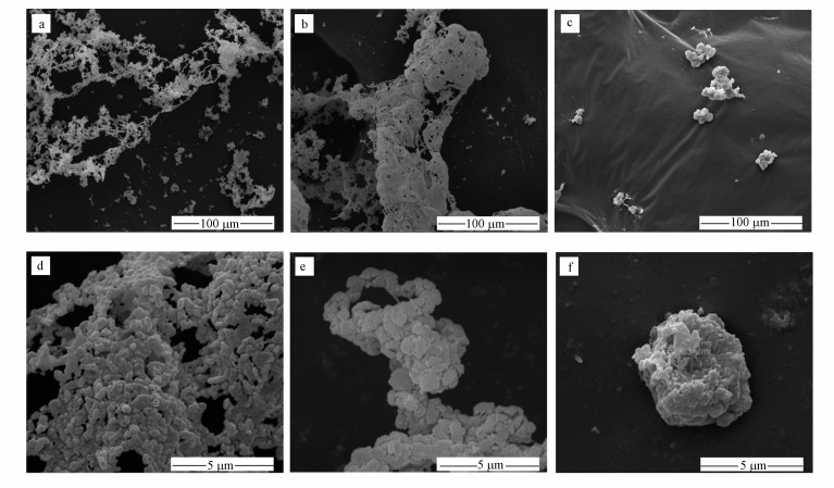 圖 5 液相中單質硫掃描電鏡照片(a、b、c分別表示反應5 s、3 min、10 min, ×1000; d、e、f分別表示反應5 s、3 min、10 min, ×20000)