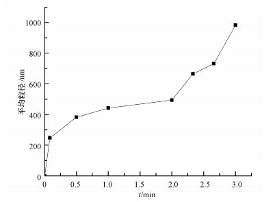 由圖 6可知, 當反應時間在0~5 s時, 體系中的單質硫顆粒粒徑迅速增大至248.1 nm, 之后在5 s~2 min內其粒徑隨時間延長而緩慢增大, 在2~3 min內, 體系中單質硫顆粒粒徑又由494.6 nm迅速增大至982.8 nm.出現這種現象的原因可能是在0~5 s時間段內, 主要是納米晶體的形成階段, 晶體形成的初始階段是一個非常快速的過程;在5 s~2 min時間段內, 單質硫顆粒的增大主要是晶體的生長, 而納米晶體生長的速度緩慢, 且受多種因素的限制(郝保紅等, 2006).在2~3 min時間段內, 由于磁力攪拌器的攪拌作用及納米硫顆粒本身的性質, 顆粒之間發生了團聚, 即多個納米硫顆粒在某些因素的影響下聚集在一起, 形成了較大的顆粒.由單質硫顆粒的增大趨勢可知, 單質硫顆粒迅速增大的階段主要集中在2 min之后, 由此可以推測單質硫顆粒增大的主要原因是顆粒之間發生了團聚.