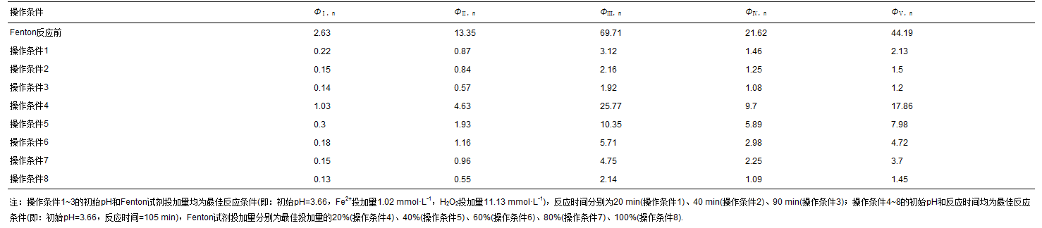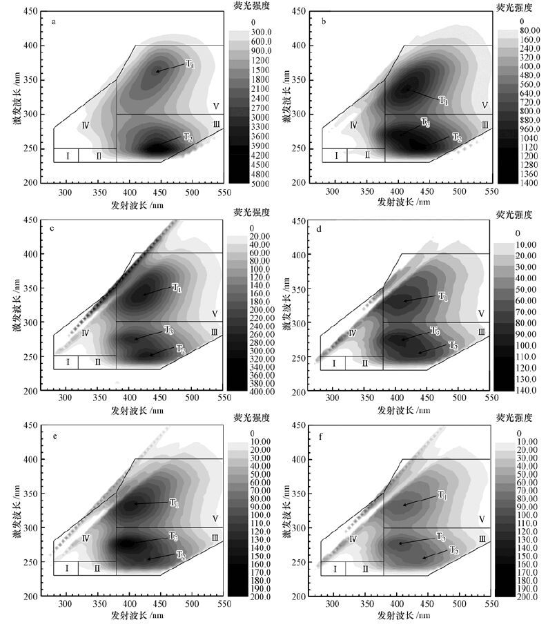 EEM在解析之前,先通過減空白和內(nèi)插值法,修正EEM被一次瑞利散射、二次瑞利散射及拉曼散射影響的區(qū)域,隨后采用FRI對EEM進行定量分析.參考以往文獻中的方法,將EEM分為5個區(qū)域,通過Origin 8.0計算某熒光區(qū)域的積分體積(Φi),即為具有相似性質(zhì)有機物的累積熒光強度,對該熒光區(qū)域的積分體積進行標(biāo)準(zhǔn)化,得到該熒光區(qū)域積分標(biāo)準(zhǔn)體積(Φi,n),用Φi,n反映該區(qū)域的特定結(jié)構(gòu)有機物的相對濃度.
